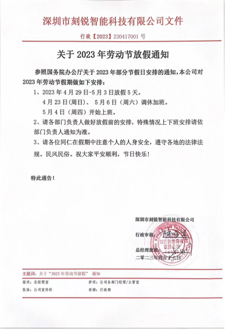 根據(jù)國《國務(wù)院辦公廳關(guān)于2023年部分節(jié)假日安排的通知》并結(jié)合本公司的具體情況,現(xiàn)將2023年五一勞動節(jié)放假安排有關(guān)事宜通知如下: