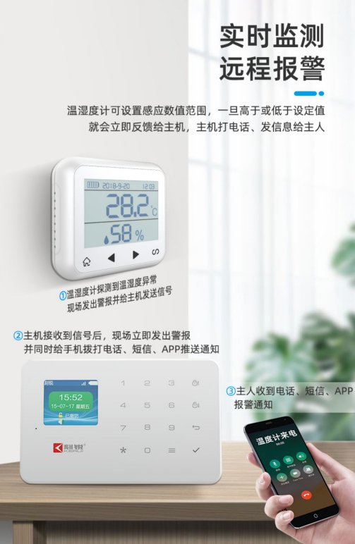 在報警功能方面,這款溫濕度報警器除了能現場報警外,還能通過電話、短信、手機APP(需連接刻銳報警主機才有此功能)等多種方式遠程報警。