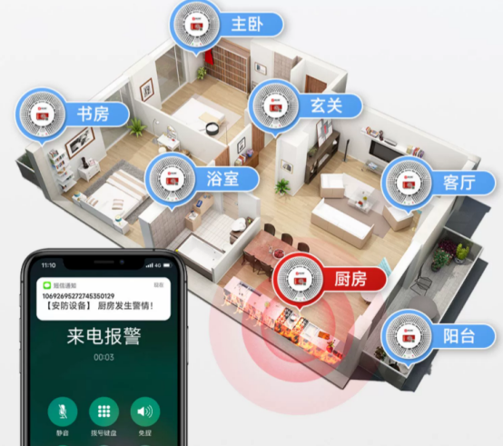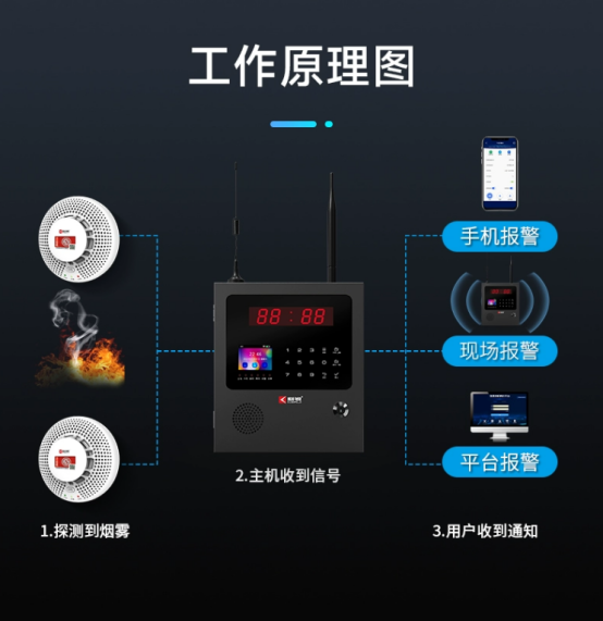 安裝有此設備的人員密集場所、易發火災場所,一旦煙霧探測器探測到了煙霧,會立刻高音報警,并向報警主機發出報警信息,報警主機接收到煙霧探測器發來的報警信息后,現場高音報警的同時還會通過多種方式向用戶告警。