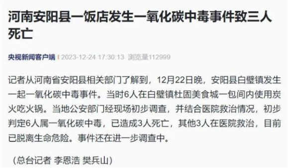 2023年12月22日晚,河南省安陽縣白璧鎮也發生一起一氧化碳中毒事件。當時6人在包間內使用炭火吃火鍋,結果導致6人一氧化碳中毒,3人死亡。