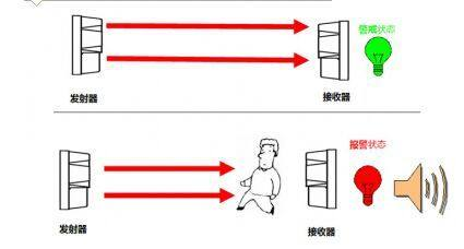 目前此類探測報警器有二光束、四光束還有多光束的紅外柵欄等。以發射機與接收機設置的位置不同分為對向型安裝方式和反射式按裝方式,反射型安裝方式的接收機不是直接接收發射機發出的紅外光束,而是接收由反射鏡或適當的反射物(如石灰墻、門板表面光滑的油漆層)反射回的紅外光束。當反射面的位置與方向發生變化或紅外發射光束和反射光束之一被阻擋而使接收機無法接收到紅外反射光束時發出報警信號。這種主動紅外報警器一般應用在周界防范居多,比如電梯、大門、閘機、窗戶、圍欄等部位都可以用。