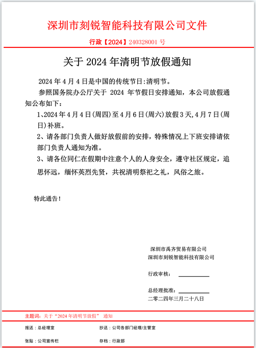 根據(jù)國家規(guī)定,結(jié)合公司實際經(jīng)營情況,2024年刻銳清明節(jié)放假安排如下: