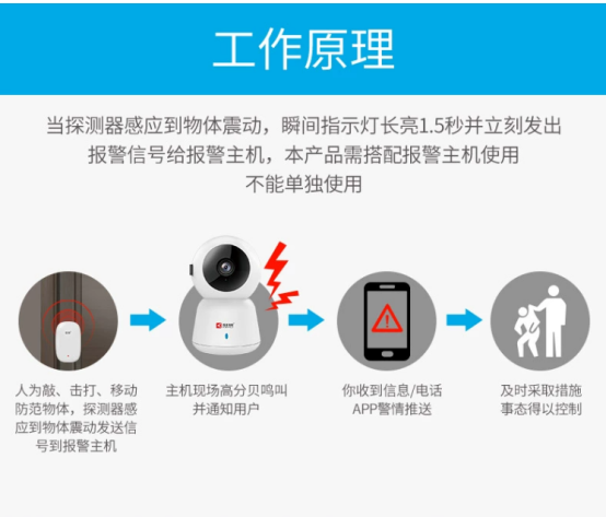 作為震動報警器,它最拿手的功能,自然是震動報警。當該報警器安裝位置周邊的震動強度超過某個值后,就會第一時間發出報警信息給報警主機(該款報警器須搭配刻銳報警主機一起使用),報警主機接收到該報警器的報警信息后,會發出高分貝報警聲,同時會通過電話、手機短信、手機APP信息等多種方式向用戶遠程告警。