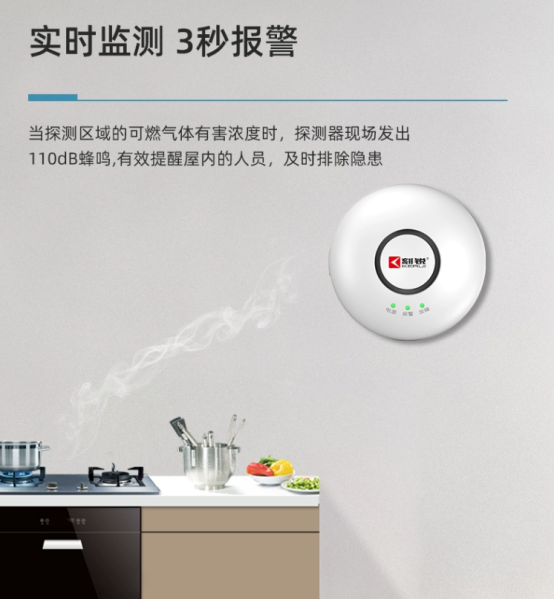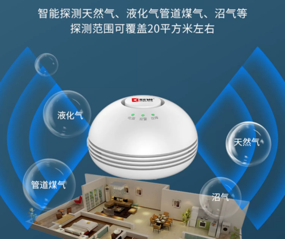 它可有效探測天然氣、液化石油氣、人工煤氣、沼氣等可燃氣體,一個這樣的燃氣報警器,探測范圍可以覆蓋20平方米左右。