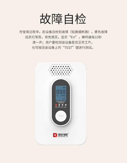 此外,這款報警器還具有故障自檢功能,在使用過程中,若設備自檢到故障(短路或斷路),黃色故障指示燈常亮,背光熄滅,顯示“Err”,蜂鳴器每10秒滴一聲;用戶要檢測該設備是否正常工作,也可按壓該設備上的“TEST”鍵進行測試。