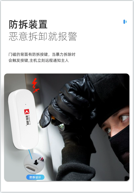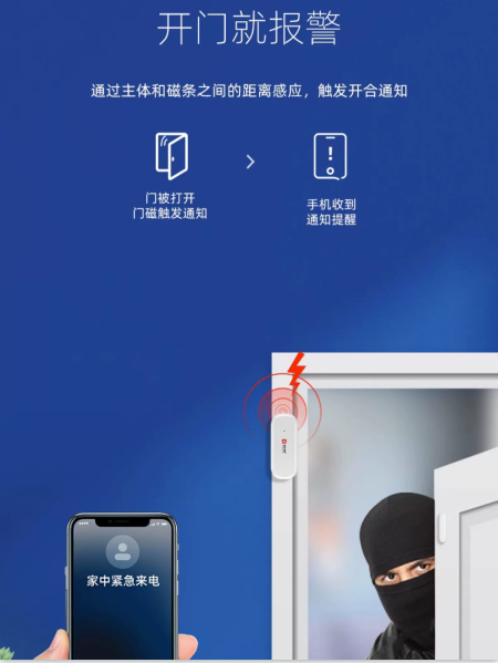 此外,其還具備防拆報警功能和低電提醒功能,能確保門磁報警器的安全,又能及時提醒用戶充電以防關(guān)機,避免盜賊開窗后門磁報警器不能報警的情況發(fā)生。