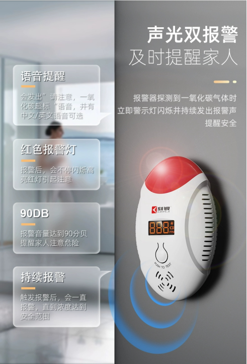 安裝有此設備的場所,當空氣中的一氧化碳濃度超標時,就會對外發出智能語音提示音和“嗚嗚嗚”報警聲,同時指示燈也會閃爍。