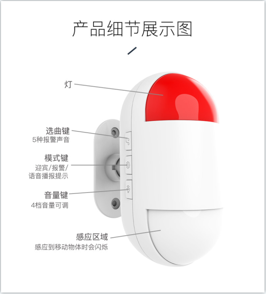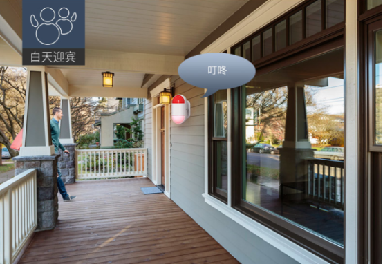 白天當家居的門鈴使用時,只要它內(nèi)置的紅外探測器(內(nèi)置或外置的)感應到有人時,它就會響起清新的音樂或者親切的迎賓語音,用戶就會知道有客人來訪。
