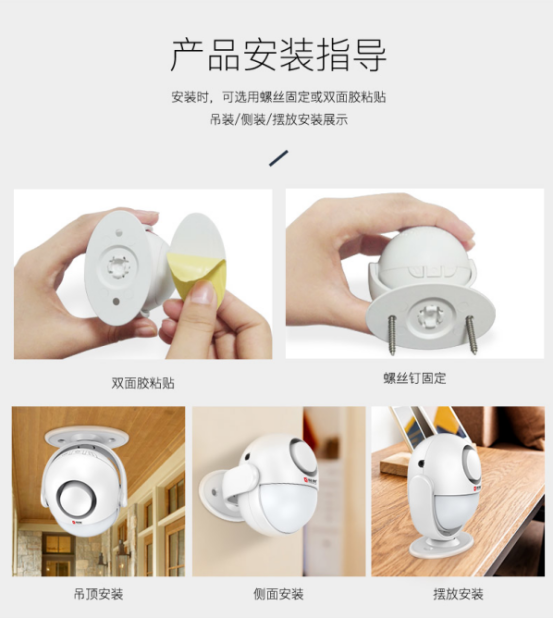 在安裝上,這款紅外報警器也是很方便,無需布線,可螺絲固定也可粘貼安裝,可頂裝也可采用壁掛安裝,底座上的旋轉支架還可以讓用戶根據(jù)安裝位置的不同,來調(diào)節(jié)可探測的距離,這樣就可以方便用戶選擇想要安裝的位置。